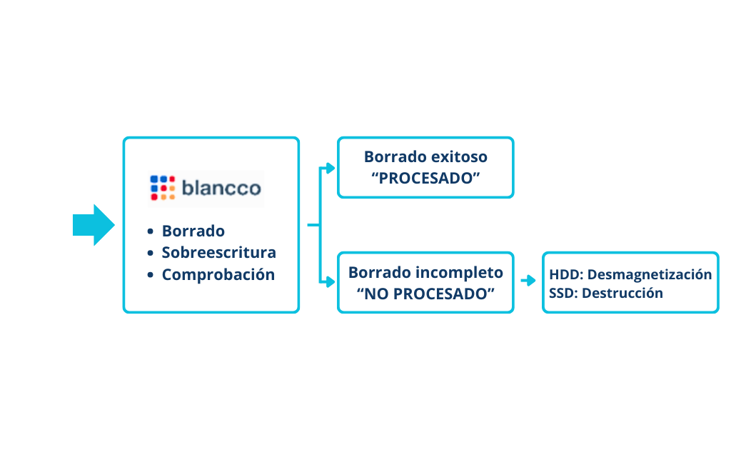 Borrado de Información en Sitio con SW Blancco. Se pueden realizar 1 hasta 3 pasadas sin que haya Posibilidad recupera información.